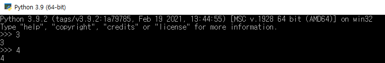 예를 들어, 3과 4를 입력하면 파이썬은 다음과 같이 integer의 데이터 형식으로 3과 4를 인식하고, 출력한다.