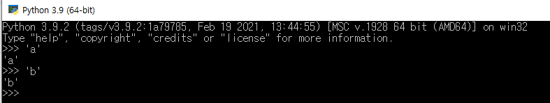 예를 들어, 문자 'a' 나 'b'를 입력하면 파이썬은 다음과 같이 string의 데이터 형식으로 a와 c를 인식하고, 출력한다.