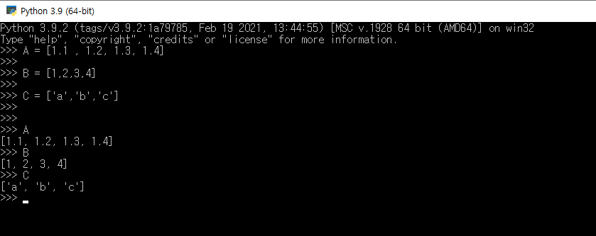 선언된 리스트를 다음과 같이 입력함으로써 저장된 리스트를 출력할 수 있다.
