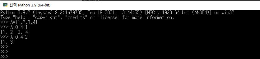 많은 양의 데이터를 포함하는 리스트에서 추출하기를 원하는 다량의 데이터를 인덱스 값으로 간단하게 추출하는 것이 가능하다. 다음의 예시 코드는 1부터 4까지 데이터를 가지는 리스트에서 1부터 4까치 추출하고, 2의 간격으로도 추출한다.