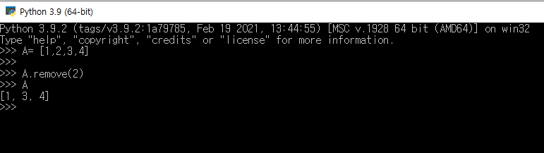 선언된 리스트 안의 데이터 값 중 지우고자 하는 데이터 값을 알 때, 다음과 같은 예시 코드로 해당 데이터 값을 제거할 수 있다. 1,2,3,4 데이터 값을 포함하는 리스트에서 데이터 2를 지워보기로 하자.