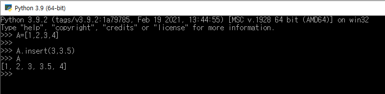 선언된 리스트의 데이터 값 중 추가하고자 하는 데이터는 다음과 같은 예시 코드로 해당 데이터 값을 원하는 위치에 추가할 수 있다. 이때 괄호 안에는 두 개의 데이터 값이 들어간다. 하나는 인덱스 값이고, 나머지 하나는 넣고 자하 나는 데이터 값이다. 1,2,3,4 데이터 값을 포함하는 리스트에서 데이터 3 앞에 3.5를 추가해보도록 하자.