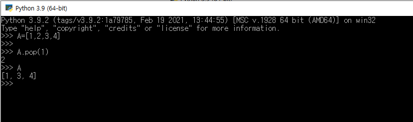 선언된 리스트의 데이터 값 중 지우고자 하는 데이터의 인덱스 값을 알 때, 다음과 같은 예시 코드로 해당 데이터 값을 제거할 수 있다. 만약 값을 넣지 않는다면, 가장 큰 인덱스 값의 데이터가 삭제된다. 1,2,3,4 데이터 값을 포함하는 리스트에서 데이터 2를 지워보기로 하자.