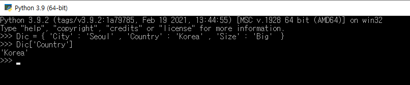 Dic = { 'City' : 'Seoul' , 'Country' : 'Korea' , 'Size' : 'Big' }