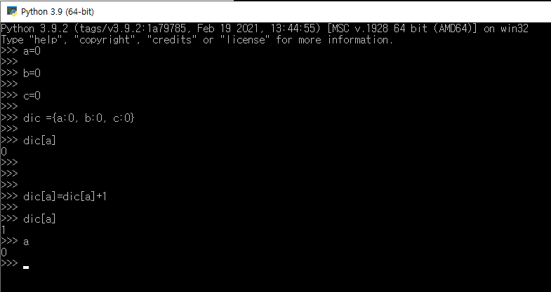 일반적으로 딕셔너리는 카운트하는 함수를 정의할 때도 유용하다. a부터 c까지 변수를 키에 넣고, 키값은 0으로 초기화하면, 키값의 증가는 다음과 같은 예시 코드로 구현할 수 있다.
