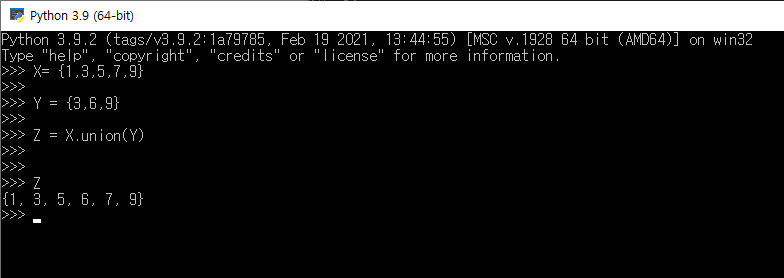합집합을 파이썬에서 구현하기 위해서, 합집합 원소를 저장할 이름을 사용자의 마음대로 정한다.