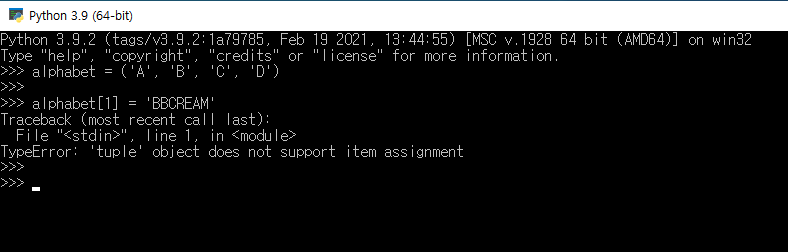 앞서 이야기했듯이, 튜플은 선언한 데이터를 바꾸는 것이 불가능하다. 이러한 특성을 튜플의 2번째 자료에 접근하여 변경을 시도해보는 다음의 예시 코드로 확인해보자.