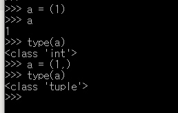 데이터 하나만을 가지는 튜플을 선언할 때, 주의사항으로 콤마를 추가해야 한다. 그렇지 않으면 튜플이 아닌 그 저 정수, 문자, 소수의 형태를 가지는 변수가 선언될 뿐이다. 이는 다음과 같이 type() 함수로 확인 가능하다.