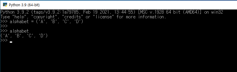 다음의 예시코드로 A부터 D까지 알파벳을 자료로 하는 튜플을 선언해보자.