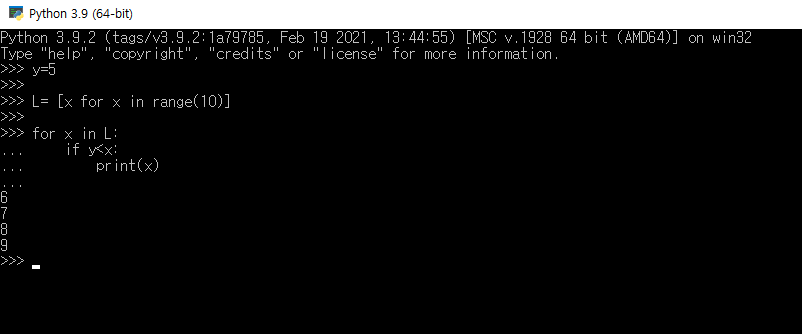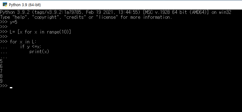 0부터 9까지 총 10개의 데이터가 저장된 리스트에서 5 이상의 데이터만 출력하는 프로그램을 짠다고 하자. 이 경우, 비교 연산문 '<='을 사용하여 해당 조건의 결과를 얻는 프로그램을 만들 수 있다.