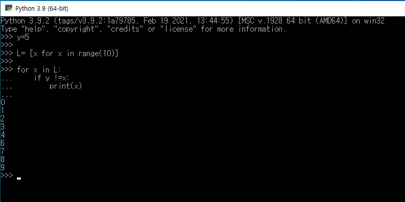 마지막으로, 0부터 9까지 총 10개의 데이터가 저장된 리스트에서 5와 같지 않은 경우의 데이터만 출력하는 프로그램을 짤 경우에는 비교 연산문 '!='을 사용하여 해당 조건의 결과를 얻는 프로그램을 만들 수 있다.
