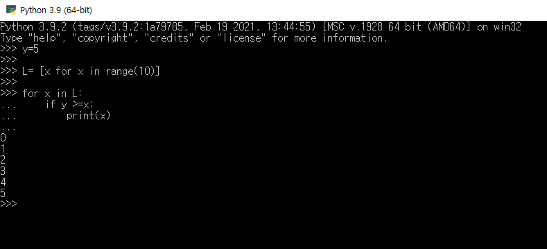 반대로, 0부터 9까지 총 10개의 데이터가 저장된 리스트에서 5 이하의 데이터만 출력하는 프로그램을 짤 경우에는 비교 연산문 '>='을 사용하여 해당 조건의 결과를 얻는 프로그램을 만들 수 있다.