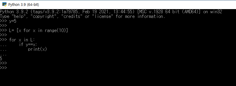 마지막으로, 0부터 9까지 총 10개의 데이터가 저장된 리스트에서 5와 같은 경우의 데이터만 출력하는 프로그램을 짤 경우에는 비교 연산문 '=='을 사용하여 해당 조건의 결과를 얻는 프로그램을 만들 수 있다.