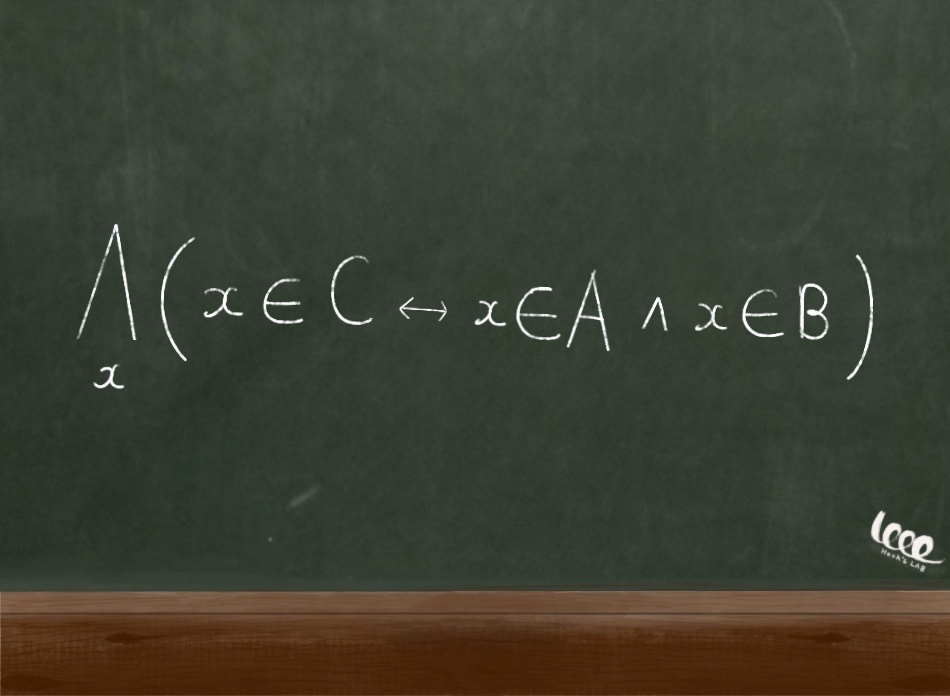 "모든 x에 대하여; x가 C에 포함되는 것은 x가 A에 포함되고 x가 B에 포함된다는 것과 항등식이다. "