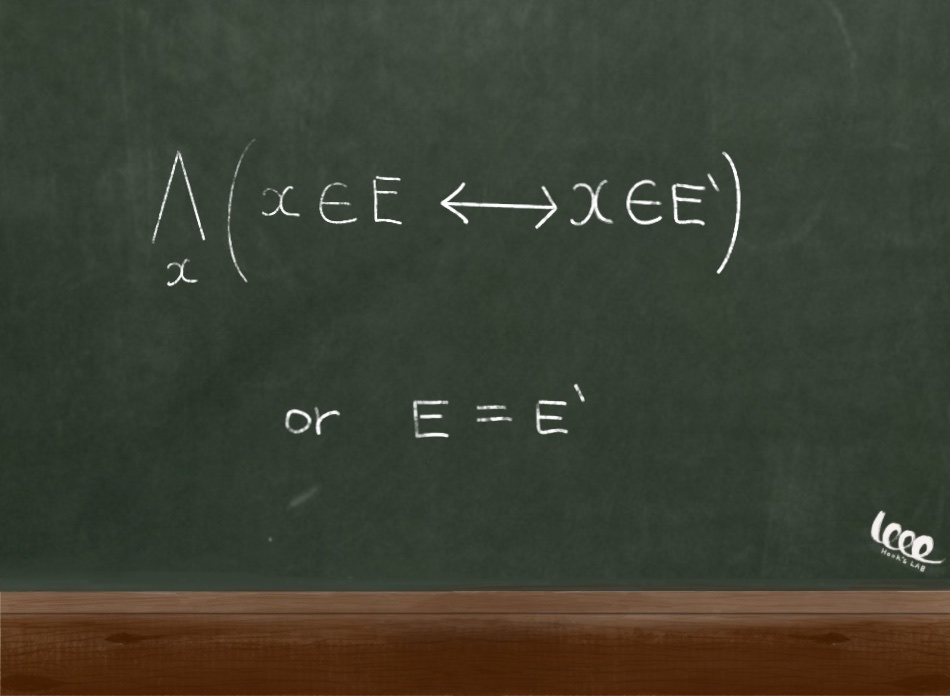 "모든 x에 대해서; x 가 A에 포함하는 것과 x가 B에 포함되는 것이 항등 관계이면, A는 B와 같다."