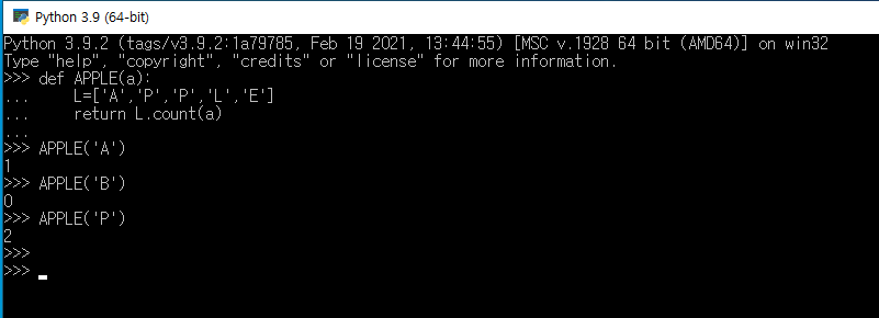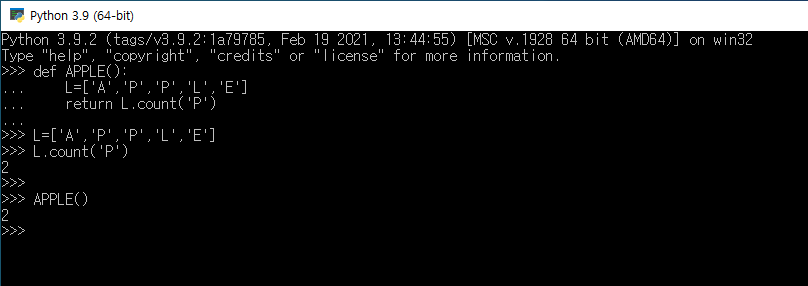 예를 들어, APPLE 라는 문자에서 P가 몇 개인지 세는 코드를 함수로 정의한다고 해보자. 예시 코드와 같이 만들면, P를 잘 셀 수 있다.