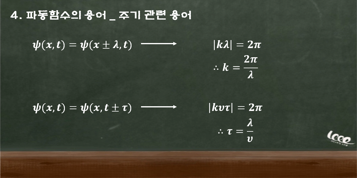 따라서, 위와 같이 파동 함수의 전파 상수, k를 정의할 수 있다. 동일한 방법으로 그 주기를 나타는 시간을 정의할 수 있다. 이때, 타우(Temporal period)는 2파이 위상 동안의 시간을 나타낸다.
