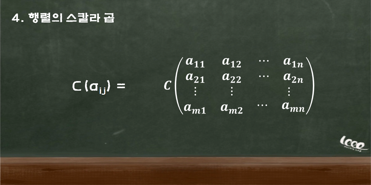 벡터를 행렬화 하여 나타낸 임의의 ij-엔트리 행렬이 있다고 하자. 이때, 벡터 행렬의 원소에 포함된 숫자(스칼라)들은 간단하게 곱 연산이 가능하다. 모든 행렬에 임의의 c 원소의 곱이 존재한다면, 다음과 같은 형태로 표기하는 것이 가능하다.