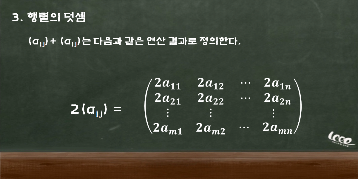 m 바이 n 행렬끼리 덧셈을 한다고 할 때, 1보다 크거나 같은 m과 n에 있어서 A와 B행렬이 다음과 같이 나타낸다고 하면 A+B 행렬은 각각의 행과 열에 맞는 원소끼리 덧셈을 해주면 된다.