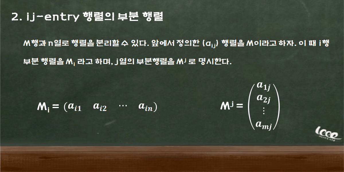 aij 로 표현한 행렬의 표기를 ij-엔트리(entry)라고 부르는데, 이는 행렬의 ij-성분이라는 의미를 갖는다. ij-엔트리는 다음과 같이 1행 또는 1열 과 같은 부분 행렬만 따로 추출한 경우, 다음과 같은 표기(notation) 방법으로 부분 행렬을 따로 나타낸다.